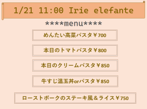 次回1/21(水)は「Irie elefante アイリーエレファンテ」が パスタや丼ものを販売予定です。